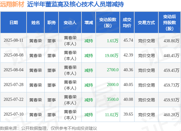 证券之星音讯万博manbext体育官网app(中国)官方网站,把柄8月12日商场公开信息、上市公司公告及来往所表示数据整理,远翔新材(301300)最新董监高及关系东谈主员股份变动情况:2025年8月11日公司董事黄春荣共减捏公司股份1.65万股,占公司总股本为0.0254%。变动时候公司股价高涨4.6%,8月11日当日收盘报44.78元。