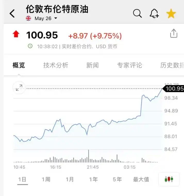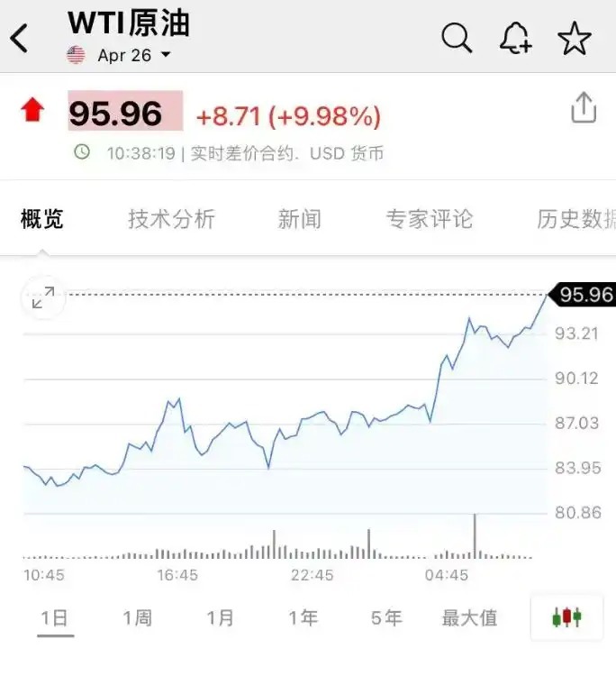 WTI原油相通大涨近10%,每桶报96好意思元。