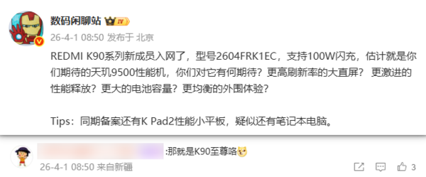 【CNMO科技音书】4月1日,数码博主“数码闲聊站”爆料称,一款可能搭载天玑9500的REDMI K90系列性能机也曾中计,型号为2604FRK1EC现金万博manbext体育官网app平台,复旧100W闪充。据网友计算这款新机可能是REDMI K90至尊版。此外,该博主还称同时备案的还有K Pad2性能小平板以及疑似新款条记本电脑。
