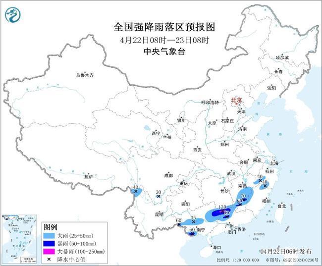 中国天气网讯 中央知足台4月22日06时发布暴雨蓝色预警: